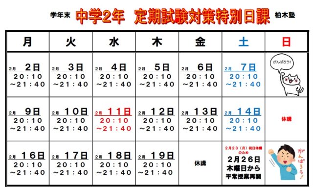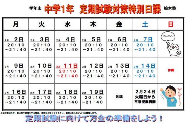 TOP > 新着情報 > 学年末試験対策特別日課 中学2年生・1年生