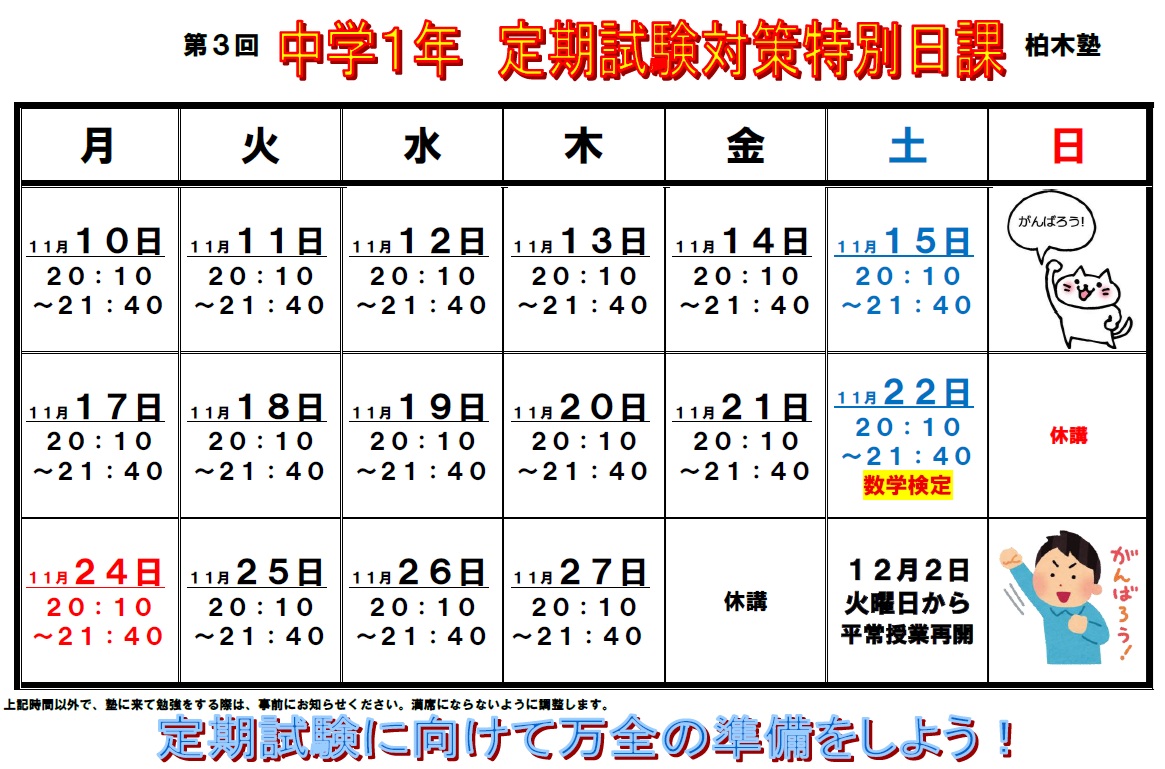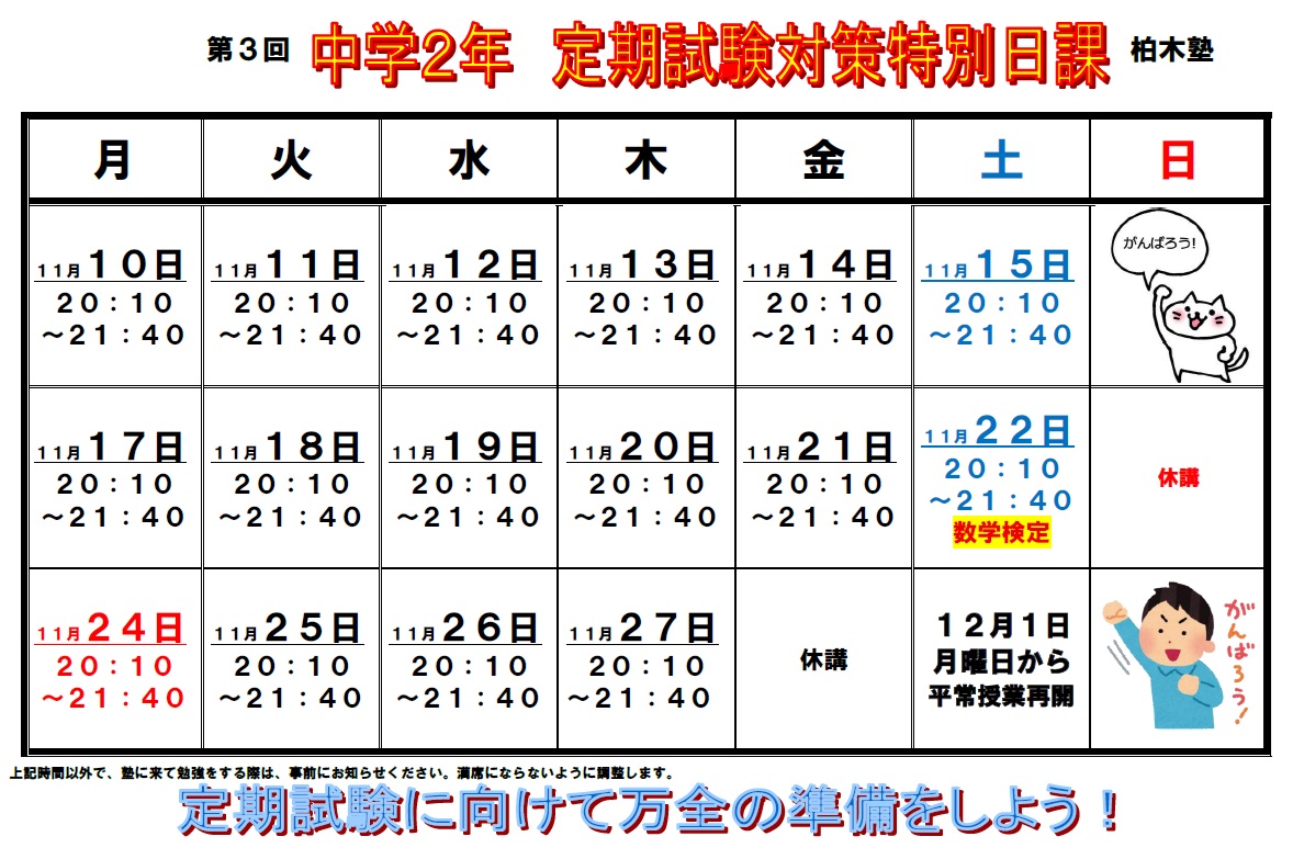 TOP > 新着情報 > お知らせ > 第3回定期試験対策 中学2年生・1年生